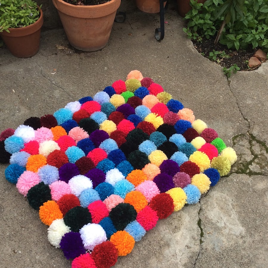 Esta es mi alfombra, hecha con 120 pompones, una buena manera de aprovechar restos de lana. Mi madre ha sido la encargada de hacerlos y engancharlos uno a uno.
