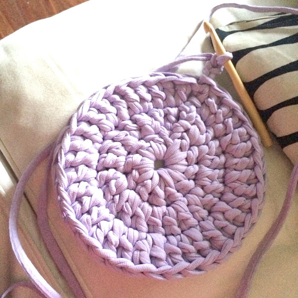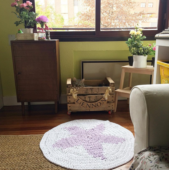 Y comenzamos a coser en redondo, haciendo un anillo mágico de 12 puntos altos y creciendo en cada vuelta. Creo que lo más complicado es ir introduciendo el otro color y contar cuantos puntos te tocan de un color y cuantos de otro. El patrón de esta alfombra es de SusiMiu, ella es la reina de las alfombras de trapillo y si no la conocéis su blog y su instagram bien merecen un ratito de vuestro tiempo.