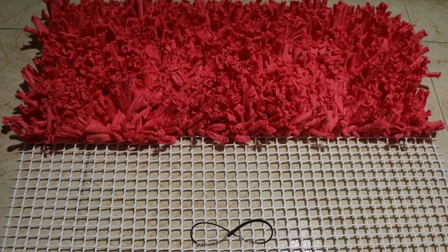 Estaréis un ratito(poneros a ver la tv...)cortando tiras de trapillo, hasta acabar tantos ovillos como necesitéis. Y después estas tiras las anudais a la malla.