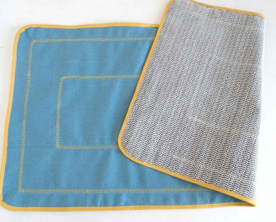 Apliqué entretela a la loneta, bordé formando un diseño de dos rectángulos, junté la tela con la alfombrilla y cosí el bies. Muy fácil y rápido.