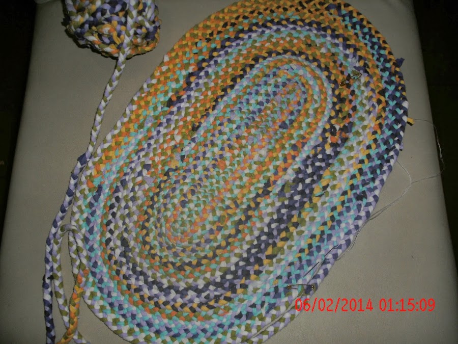 PRIMERO CORTE LOS RETAZOS EN TIRAS, DE UN CENTIMETRO MAS O MENOS, LAS FUI UNIENDO Y FORME TRES OVILLOS, DESPUES LAS TRENZE FORMANDO OTRO OVILLO QUE ME QUEDO ASI.