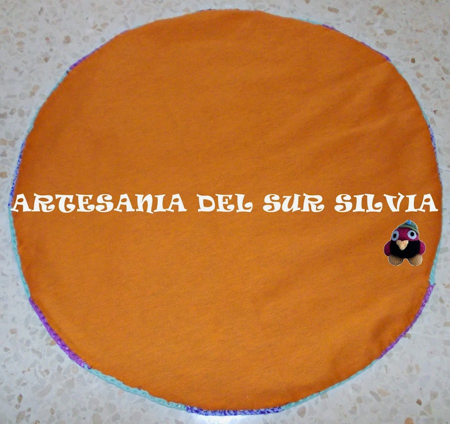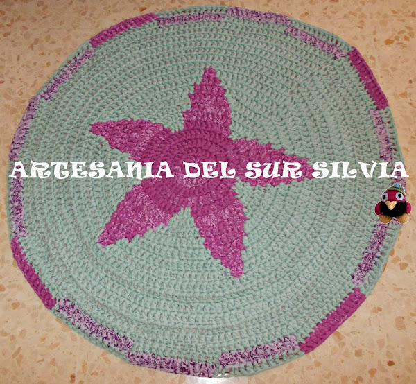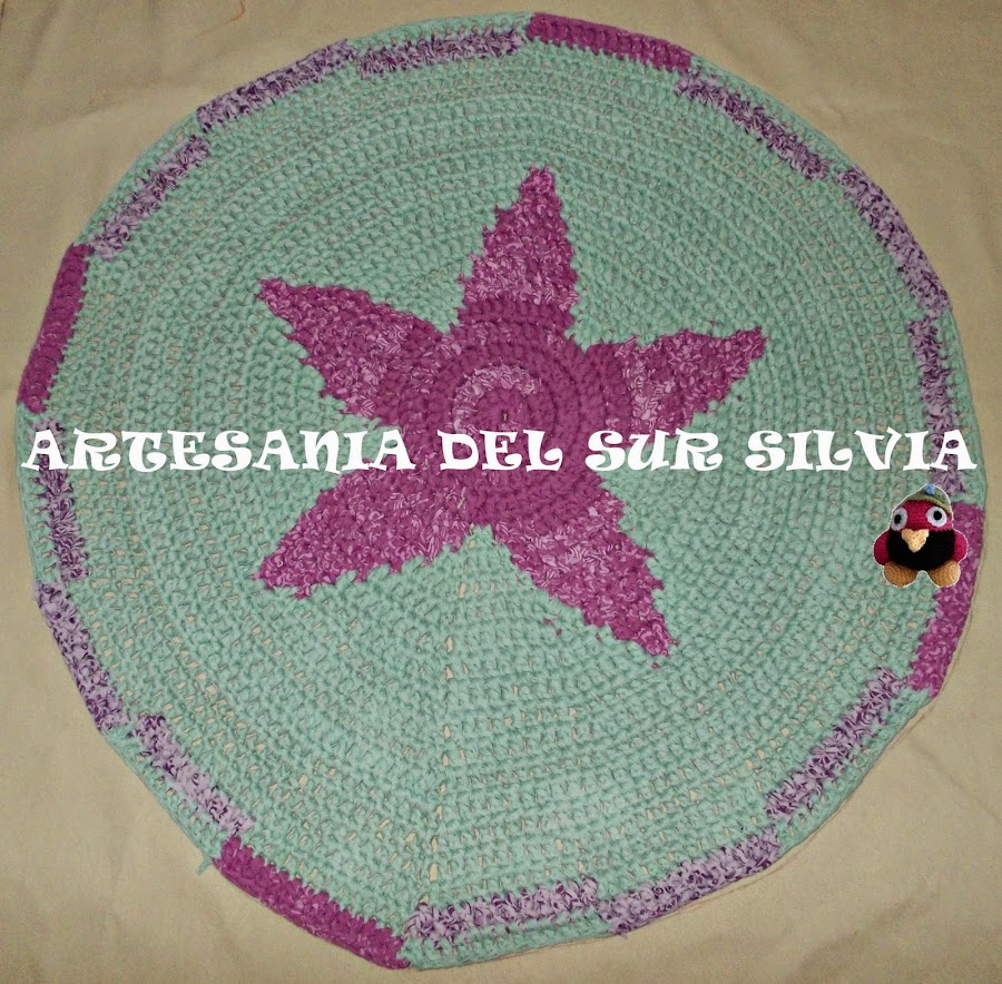 Esta alfombra mide un metro de diámetro, ella me mando en una foto el diseño que quería y yo se lo hice aunque cambiando los bordes que los hice de otra manera para que fuera más exclusiva y no el típico único borde alrededor. Le puse una base de loneta para hacer más fácil su limpieza.