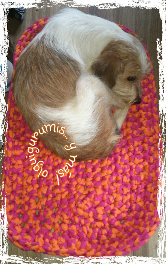 Ayer hice esta alfombra de trapillo (por fin le di un uso a ese rollo grande que compré hará un par de años...) Parece sencilla y nada del otro mundo, pero es para alguien muy especial, nuestra nueva perrita Lluvia. Ella necesitaba un hogar y mi marido nos la ha traído a casa. Me siento muy afortunada y agradecida, porque encima de preciosa es muy buena.
