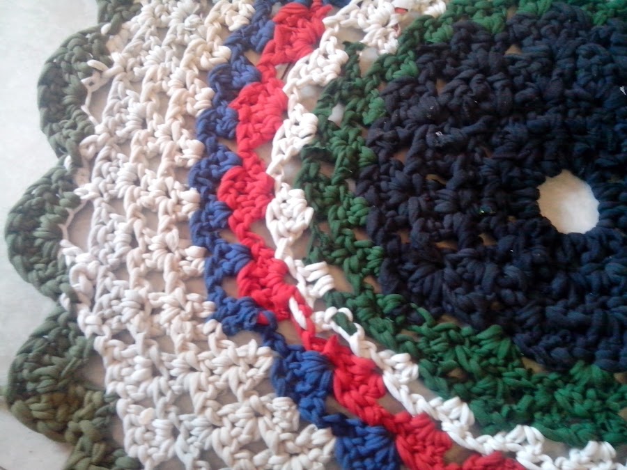 Como empecé con la fiebre del trapillo, y me quedan muchas camisetas por reciclar, me decidí por una alfombra que vi en Youtube. Cortando, estirando y agujeteando. Vuelta a vuelta me quedó esta estupenda alfombra.