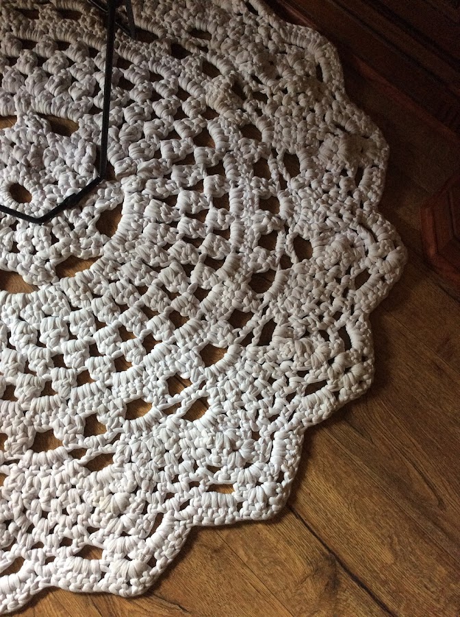 Esta preciosa alfombra blanca me la hizo mi madre este verano. Sólo hay que buscar un patrón de un tapete de ganchillo que os guste, y hacerlo en este caso con trapillo blanco. El resultado es una gran alfombra que queda ideal en cualquier rincón.