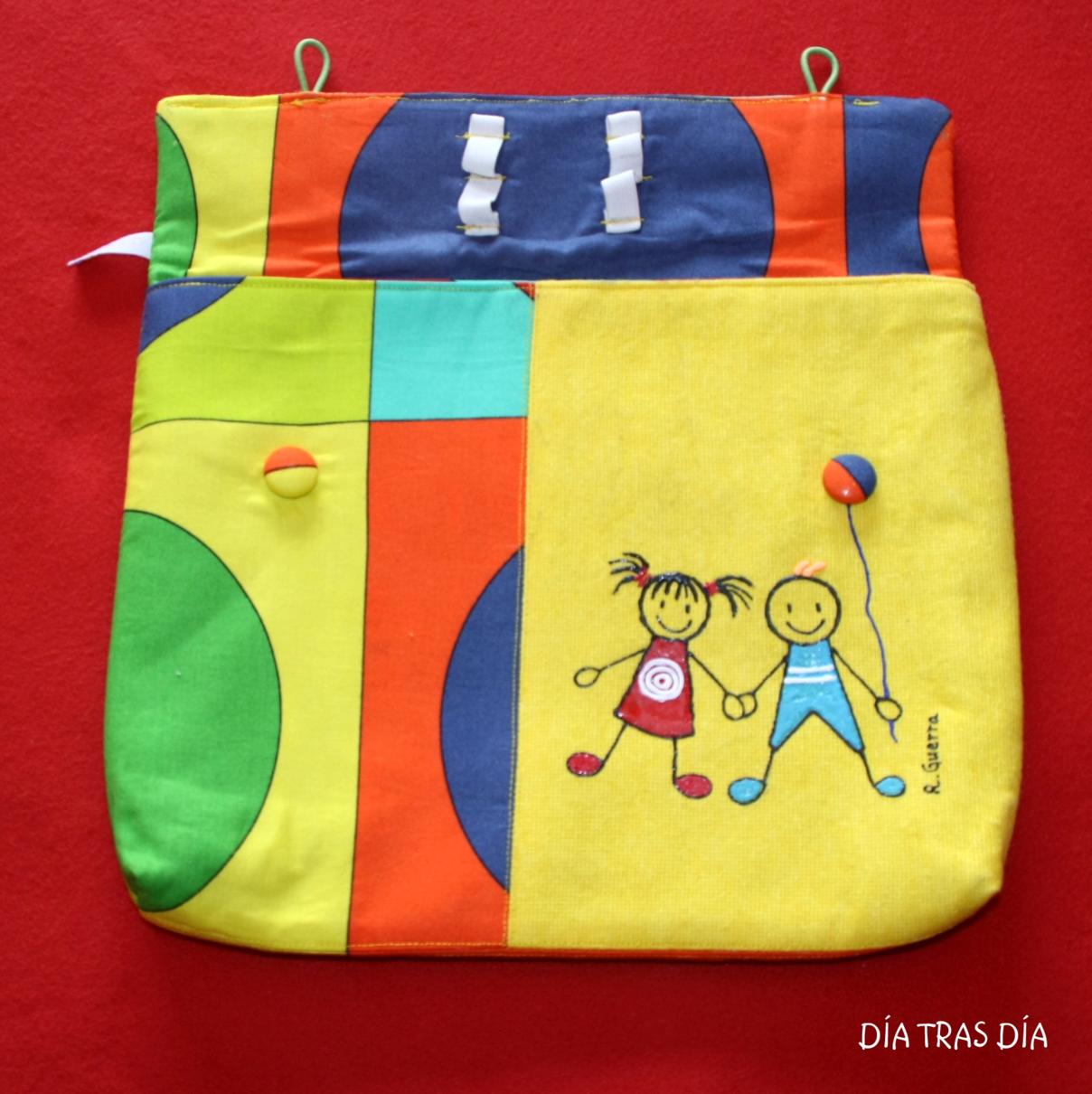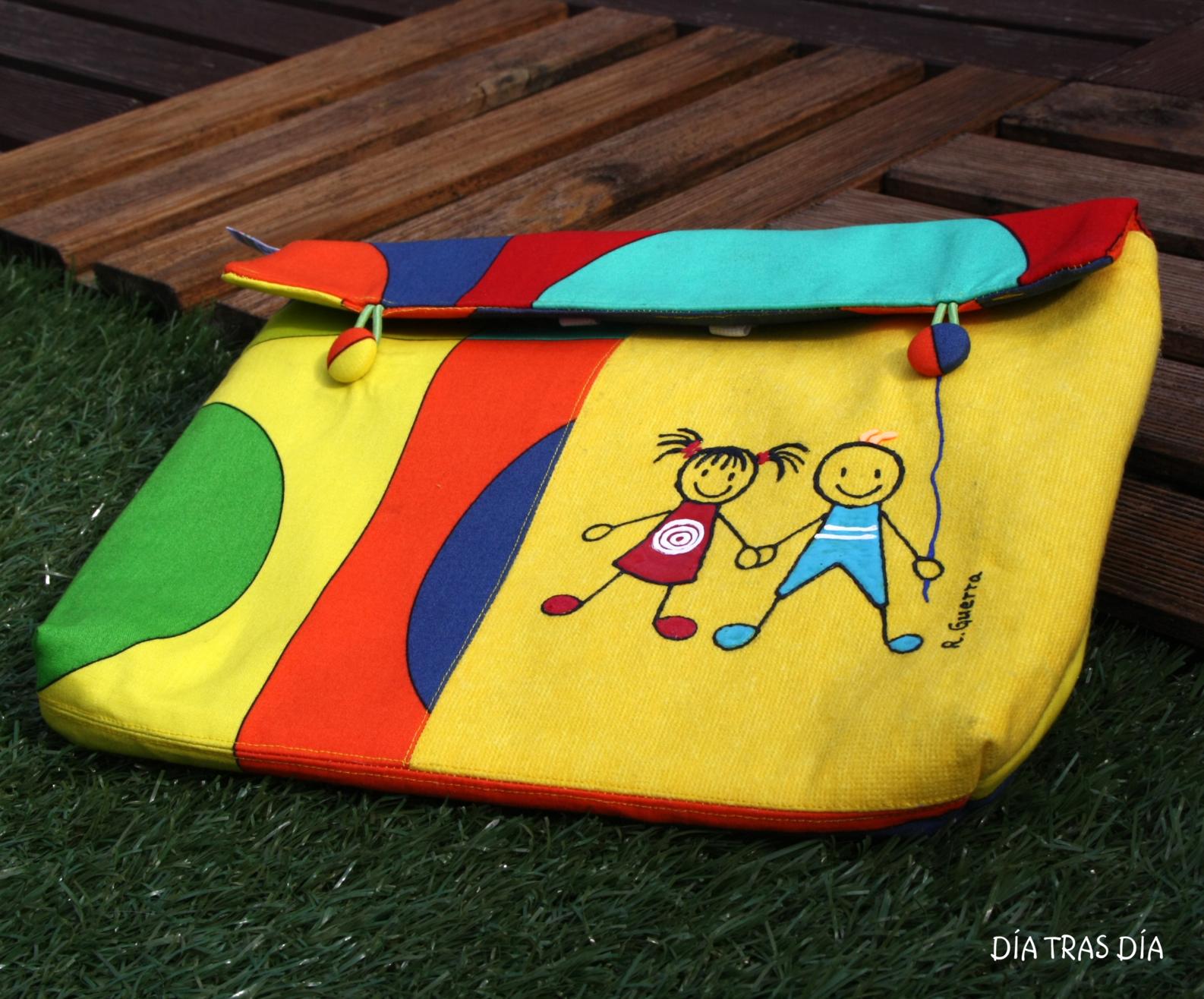 Y finalmente, en la parte delantera, empleé una tela en color liso amarilla, combinando con la anterior de colores, donde he dibujado dos pequeños monigotes, un niño y una niña cogidos de la mano, para darle un cierto toque infantil ;-).