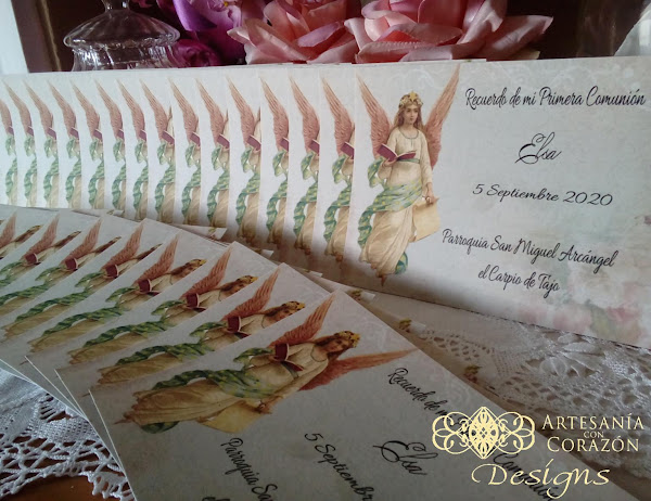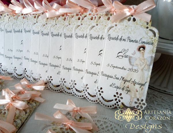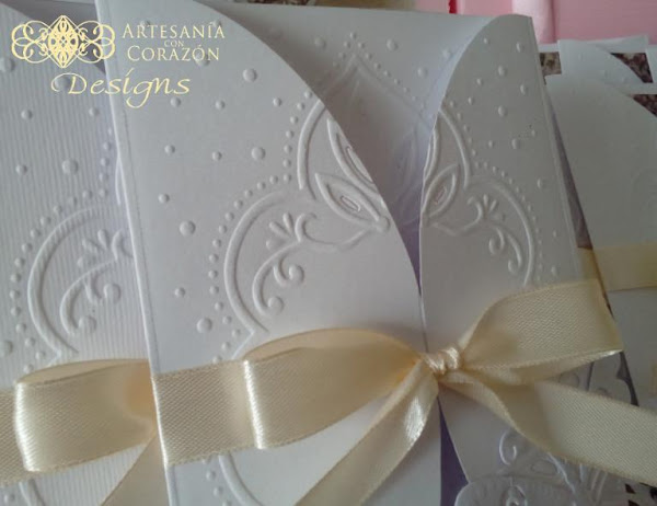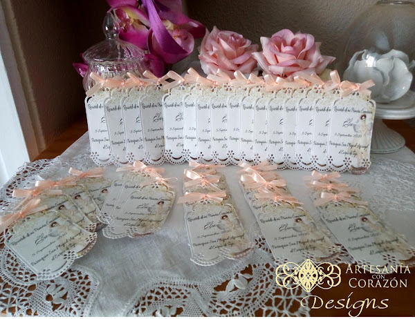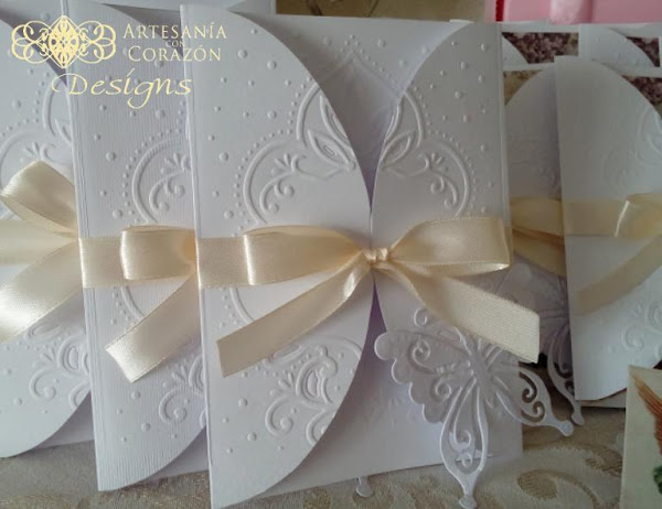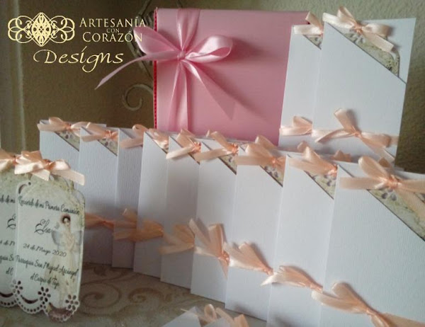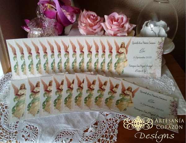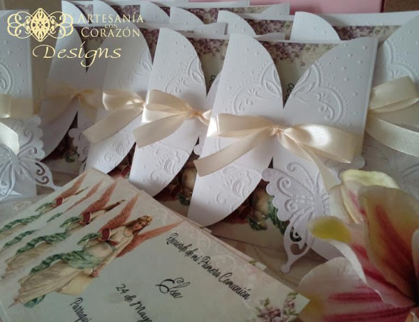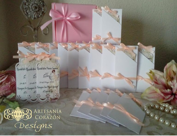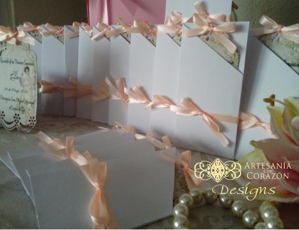 Y por otro lado, estas bellezas, tarjetitas troqueladas con su lacito y presentadas en sobres hechos a medida. Diseño a todo color y personalizado.