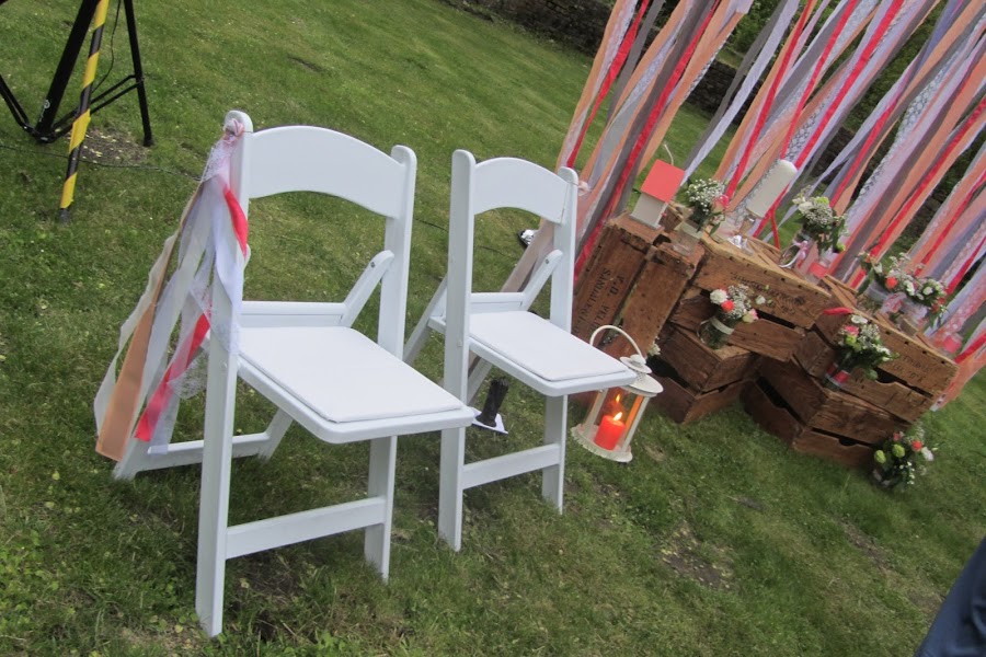 Tome tiras de tela que combinaran entre si y las amarre a una cuerda , la distancia entre lado y lado era demasiado larga asi que decidi decorar solo la parte donde seria la ceremonia.