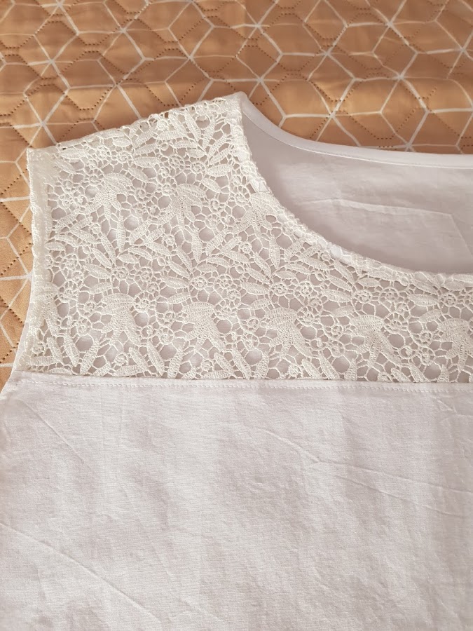 En esta foto se aprecia bien la cmbinacion del guipour y el tejido de algodon y como he rematado el cuelllo con cinta al bies de algodon de color blanco , para que el guipour se vea bien rematado.