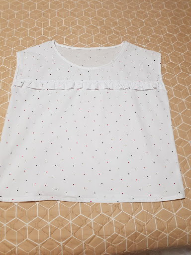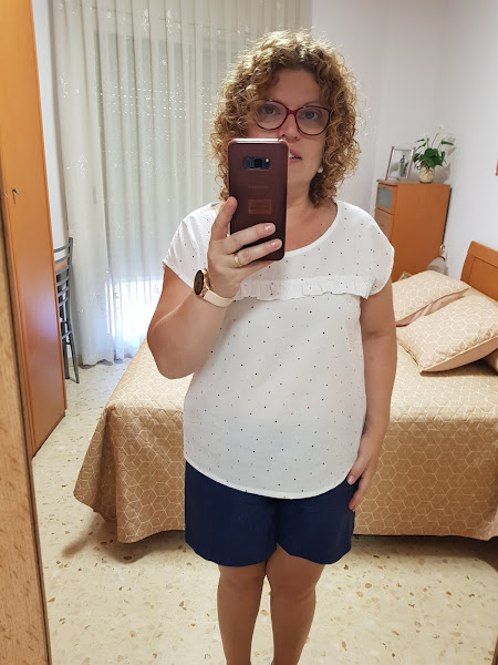 El patrón de la blusa es un patrón propio que he dibujado con mis medidas y que lleva cuello redondo , manga caída que sale de la prolongación del hombro , el corte es más bien anchito y además como toque he cortado la parte delantera y he cosido un volantito muy pequeñito de adorno.