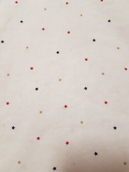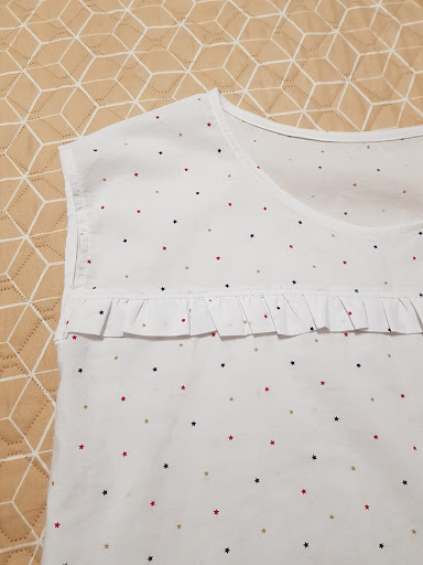 El tejido de la blusa es un algodón finito de fondo de color blanco con el dibujo de unas estrellitas muy pequeñitas en diferentes colores.
