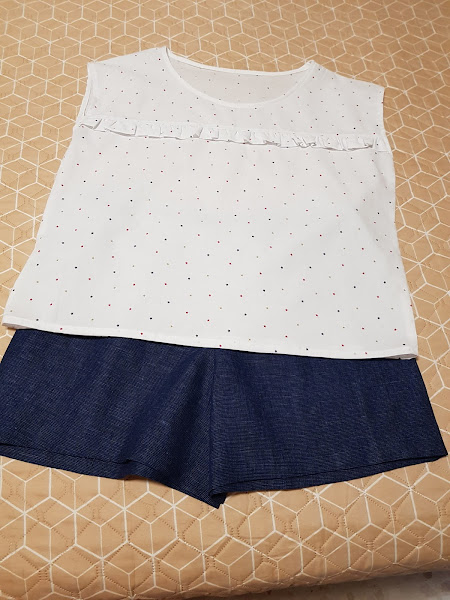 El conjunto esta compuesto por una blusa con un volantito en el delantero de adorno y unos shorts muy sencillos y resultones.