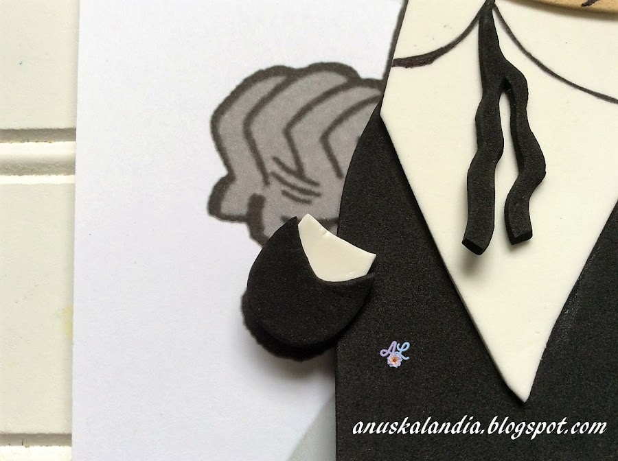 4.- Comenzaremos el pegado. La pequeña manga del brazo derecho, pegamos sobre el puño de la manga de la camisa y a su vez, las dos piezas juntas al traje, pero solo poniendo una fina línea de pegamento en un lateral.