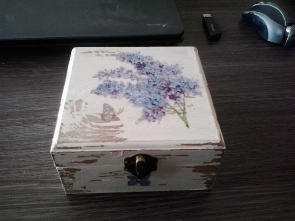 Y esta última fue un regalo para mi suegra. Usé una servilleta con unas lilas que a mi me encantan, para el fondo, primero le pase betún directamente, apliqué cera, luego un blanco roto y lo decapé