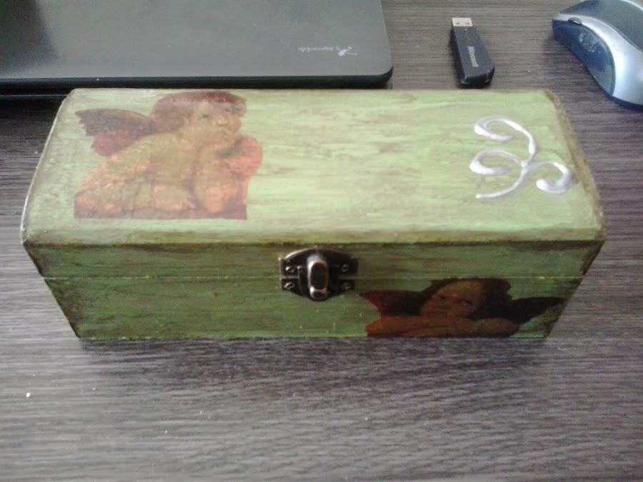 Esta fue destinada a mi cuñada, un detalle para Navidad. Ya tenía un cuadro con estos ángeles y pensé en hacerle la cajita a juego.El fondo es verde césped envejecido con betún