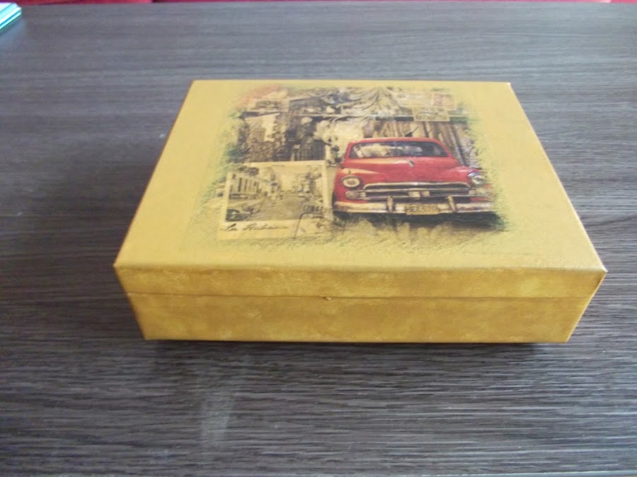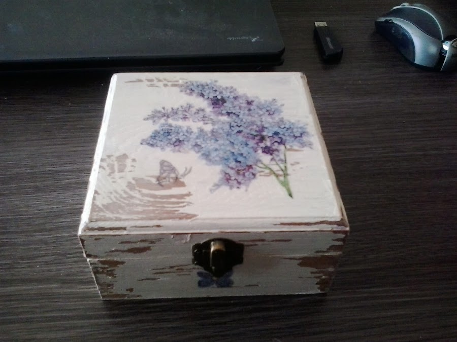 Esta cajita se la hice a mi pareja, es una caja de te que la reciclé para que el pudiera guardar todos esos tornillos que siempre acaban desperdigados por la caja de herramientas. No le hice foto del interior, pero lleva compartimentos
