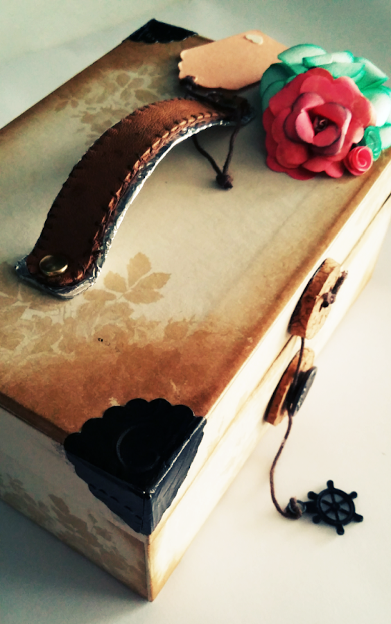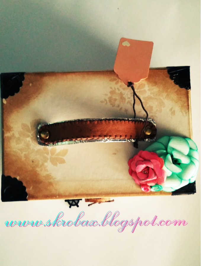 La agarradera la realice con papel aluminio reforzado con cartón en su interior y un trozo de semi-cuero que tenia por casa; lo cosí con punto festón y le coloque a los extremos un par de brads dorados