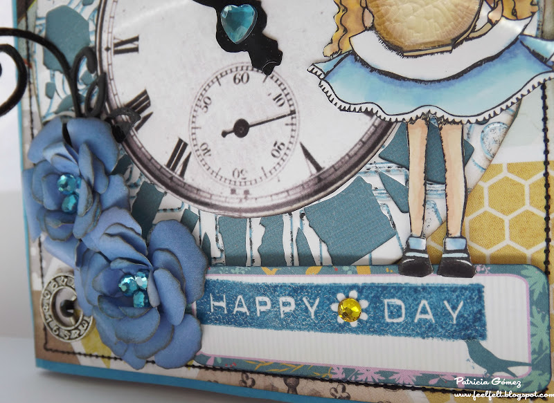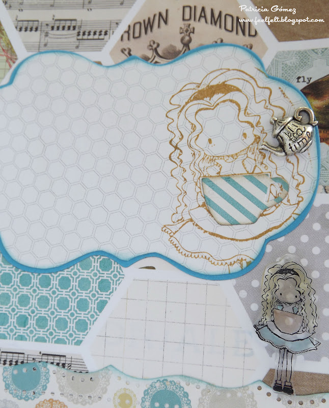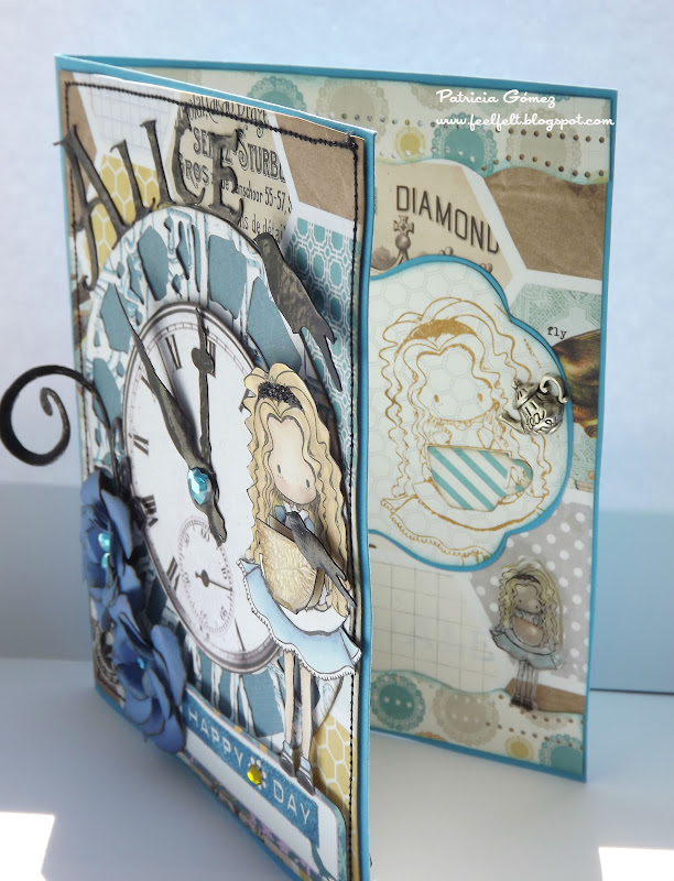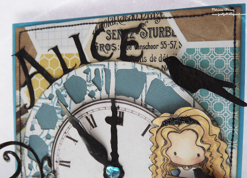 Alice, coloreada con promarkers, lleva un tazon hecho añicos (crackle accents) sobre el que reposa un pajarillo. En la diadema lleva stickles Black Diamond.