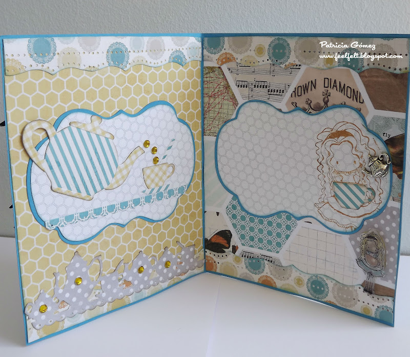 En la parte izda, tetera y taza Die-namics Time for Tea, y debajo el troquel Cottage Cutz Tea Time Border. La troqueladora superior e inferior es Martha Stewart Pucnh around the page- Cherish. Las etiquetas centrales, a ambos lados son Spellbinders Labels Fourteen.
