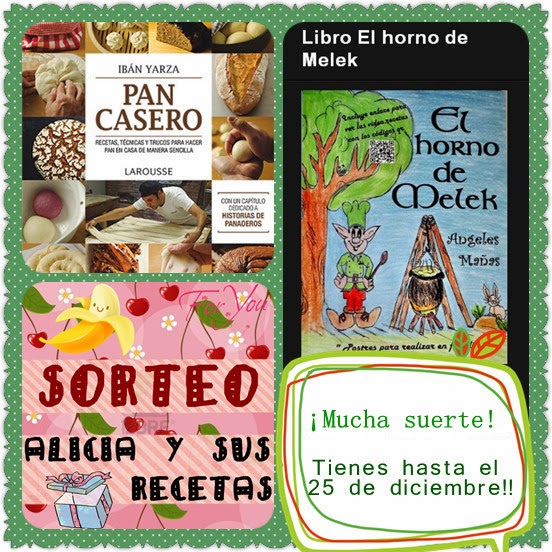Sabéis??, la mamá de mi amiga Marina, Alicia del blog "Alicia y sus recetas" está de celebración, y es que compartiendo sus platos e ideas en la cocina, ya ha alcanzado los 100 seguidores. Para celebrarlo ha decidido hacer un sorteo y regalar entre los que participen dos fabulosos libros: uno sobre pan y otro de repostería.