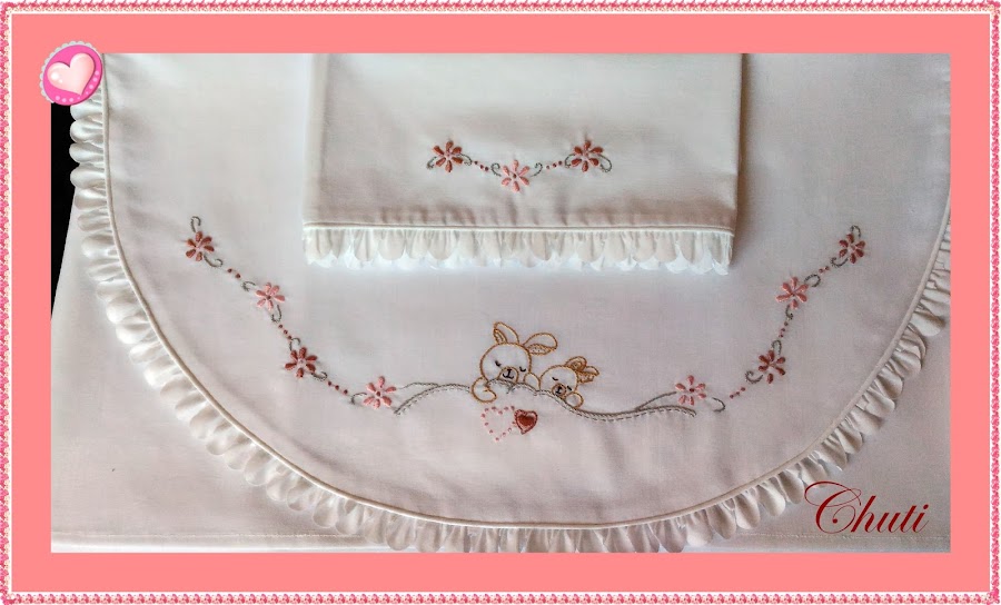 Empiezo por este juego de sabanitas para el moisés o cuco. El dibujo lo copié del blog de Lavanda e Lillá que tiene verdaderas maravillas, para mi gusto es, si no la mejor, si de las primeras en cuanto a bordado a mano se refiere, tiene un gusto exquisito y primoroso.