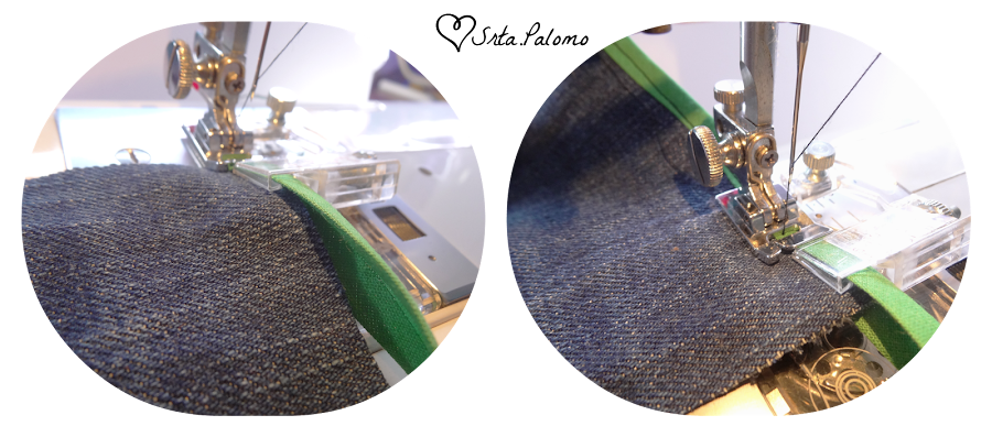 Después de colocar el bies, yo pongo el prensatelas en la máquina de coser para empezar a colocar la tela. La tela va a ir alojada en la misma ranura en la que va el bies, metida en medio de la cinta (a modo de sandwich) . Veamos las fotos: