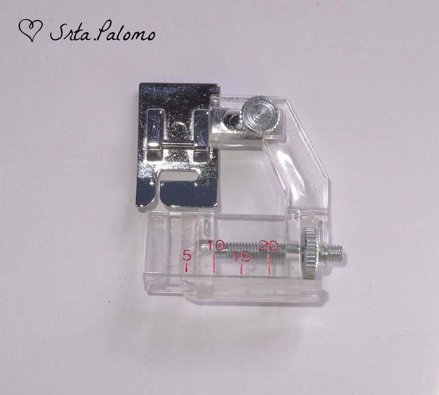 Este es mi nuevo amiguito. Un prensatelas que tiene adosada otra pieza de plástico que es la que nos va a ayudar a poner el bies en un plis plas