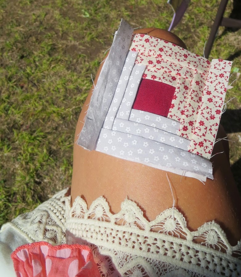 Cuando descubrimos el puesto de Esperanza, de Bernina Navarra, y de Eva, de Puntadas Agrupadas, nos llevamos una sorpresa muy grata. Eva había llevado todo el material necesario para enseñar a hacer una Almazuela. Porque una Almazuela no solo es sinónimo de patchwork sino que también hace referencia a una técnica parecida al log cabin pero, como dijo cariñosamente Belén, "con morcillitas".