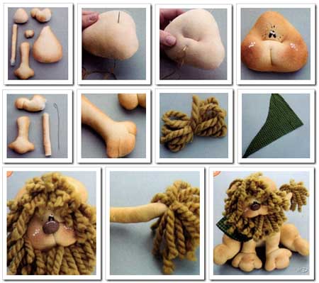 Nariz: cortar el molde en tela marrón, pasar bastilla, rellenar con vellón y cerrar. Pegar las orejas en la cabeza, la nariz a la cara y la melena en el contorno de la cara y la cabeza.