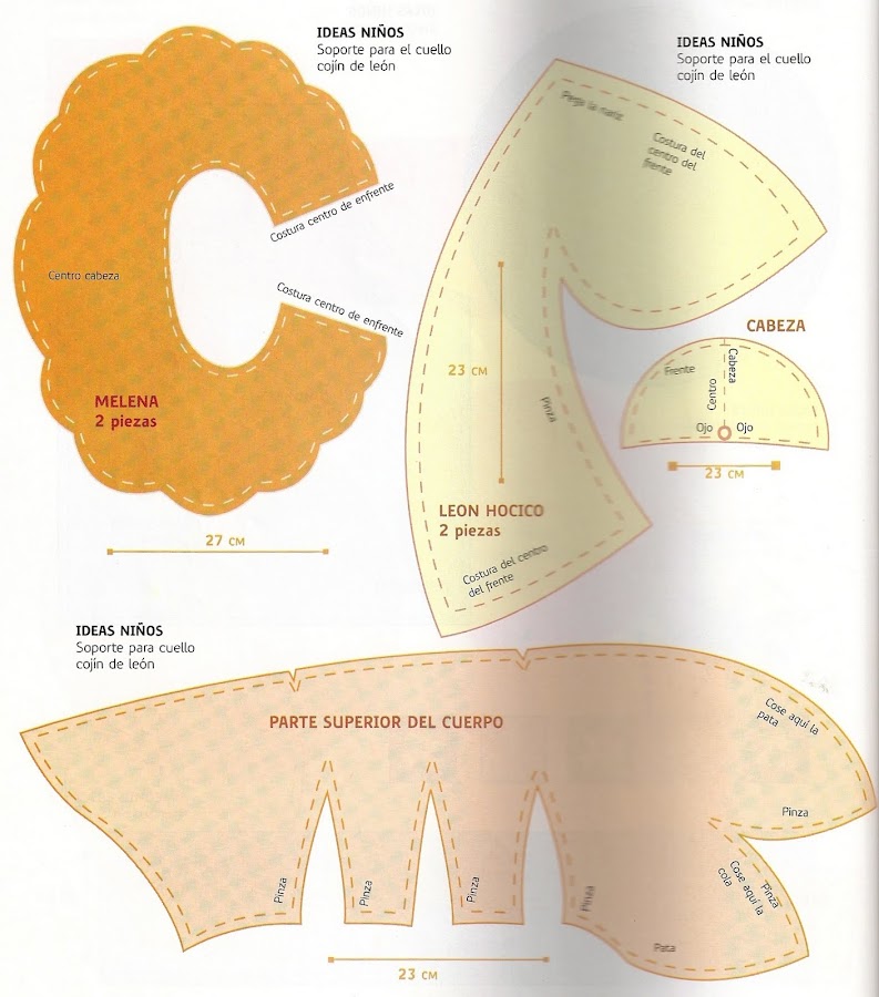 Copia y amplia los diseños del patrón. Transfiere todas las piezas que forman el cuerpo y la cabeza, a la tela amarilla. La melena y la punta de la cola trazala sobre la tela naranja. Arma por separado el cuerpo, la cabeza y las extremidades. Cuando las tengas listas, voltealas para rellenarlas con perlas y delcrón. Posteriormente une las partes y da forma al león. Para que la melena quede firme coloca entre la tela una pieza de guata, cose, voltea y, una vez terminada, colocala por detrás de la cabeza. Une la punta de la cola. Forra la naríz con tela naranja, cósela sobre la cara. Pega los ojos y borda la boca con punto atrás.