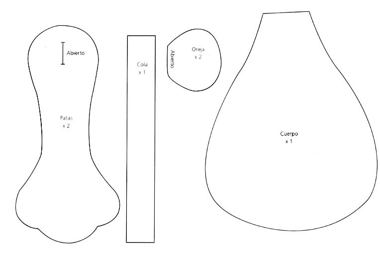 Transferir los moldes del cuerpo, la cabeza, orejas, patas, cola y brazos en tela de frisa blanca (o similar).Coser enfrentando los derechos y dejando una abertura para poder dar vuelta la pieza. Rellenar con vellón. Pintar con técnica de aguada con pintura acrílica siena natural. Dejar secar y pintar con pincel seco siena natural.
