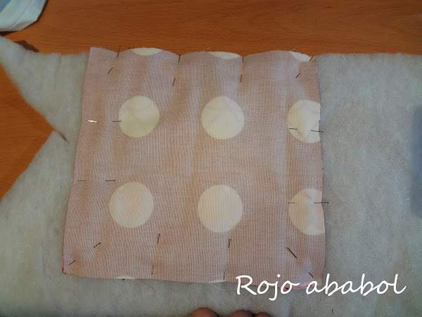 Sujetamos con alfileres y colocamos sobre la guata. Recortamos la guata un poquitín más pequeña que el rectángulo de telas.