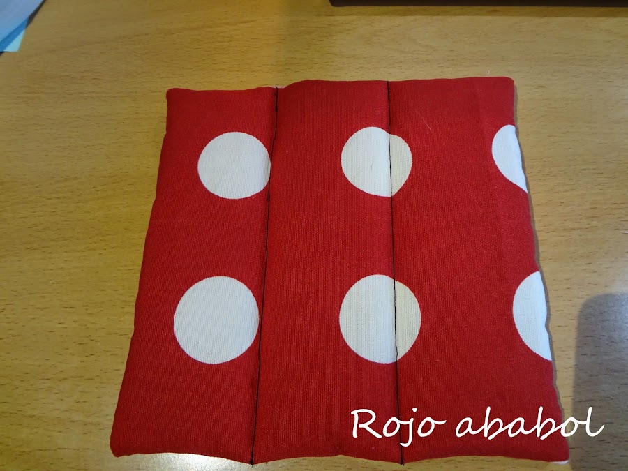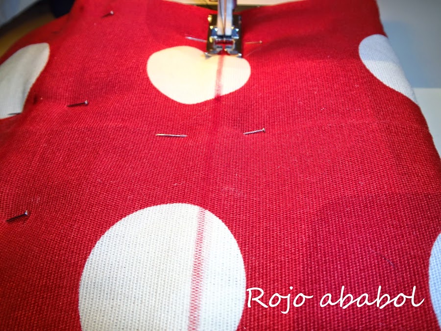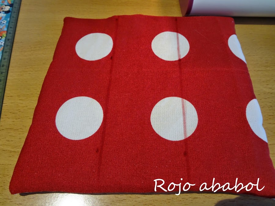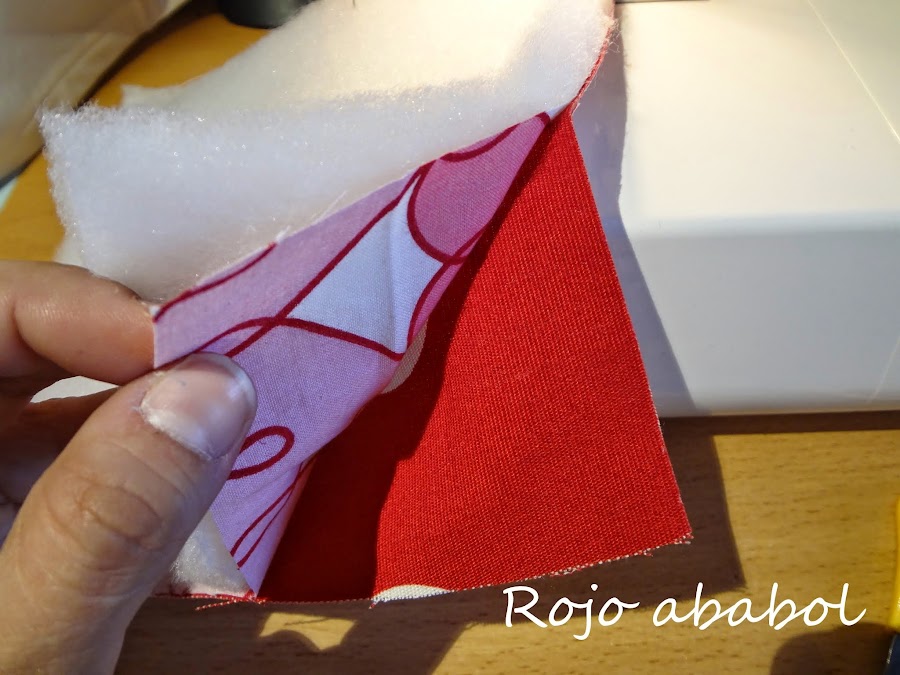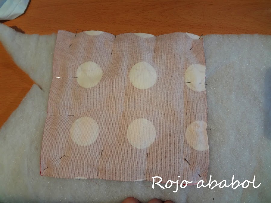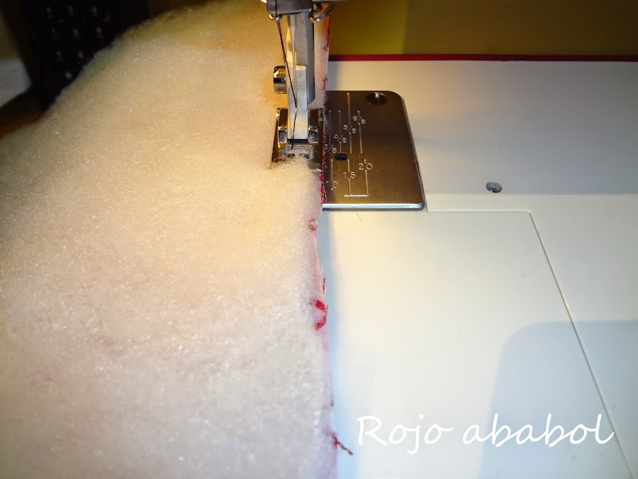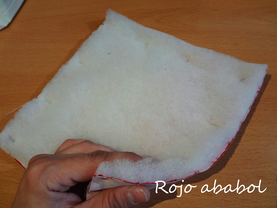 El orden de las telas es el que hemos tenido todo el tiempo, las dos telas cara con cara y encima de una de ellas la guata. Cosemos todo el contorno dejando un hueco en un lado de unos 3 centímetros.