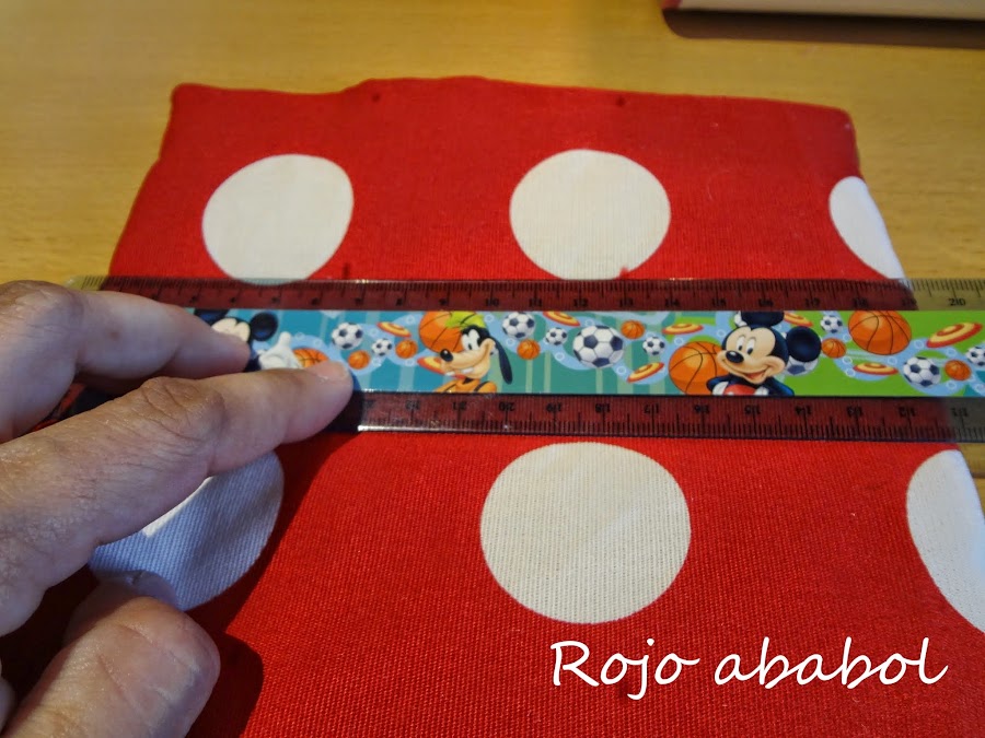Empezamos por recortar un rectángulo en papel de 22 cm x 20 cm. es más sencillo tener ya el rectángulo como patrón que dibujar en la tela, o al menos a mi me lo parece.... Pasamos a la tela.