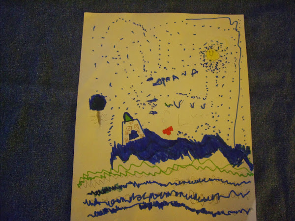 y como a mi hija le gusto muchísimo el almohadón y estaba muy contenta, me realizo un dibujito para regalarme en forma de agradecimiento. Tiene solo 4 años, pero les describo un poco la obra de arte, es una casita en un jardín, con un árbol y un gran sol, esa manchita anaranjada es una mariposa bebe, y pajaritos volando, luego escribió su nombre,....no esta bonito??, es de la mejor forma que me lo podía agradecer, con el dibujo y un beso y abrazo!!!!