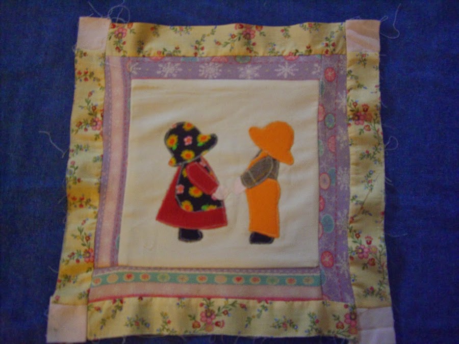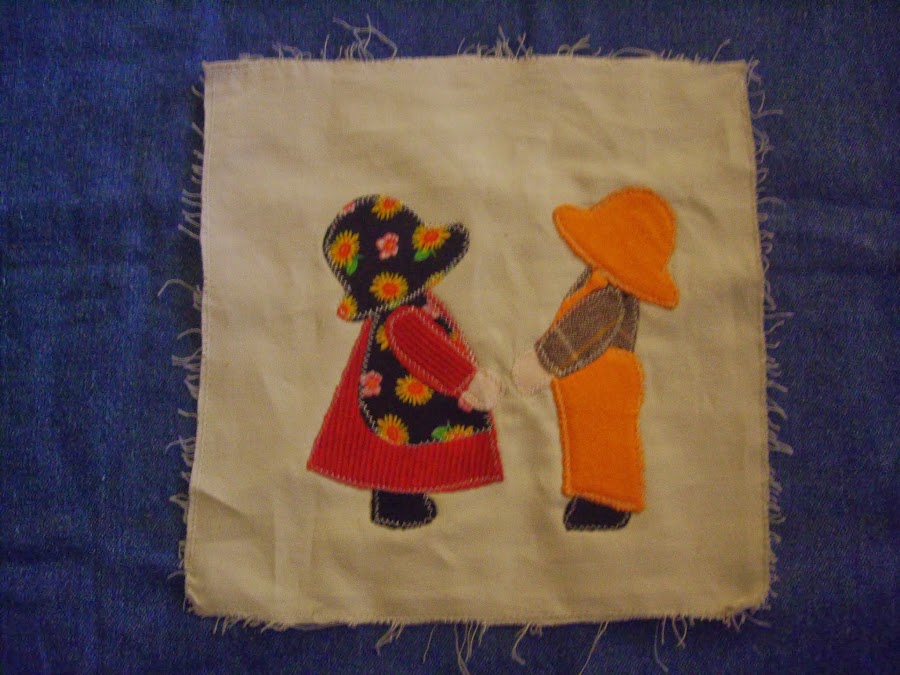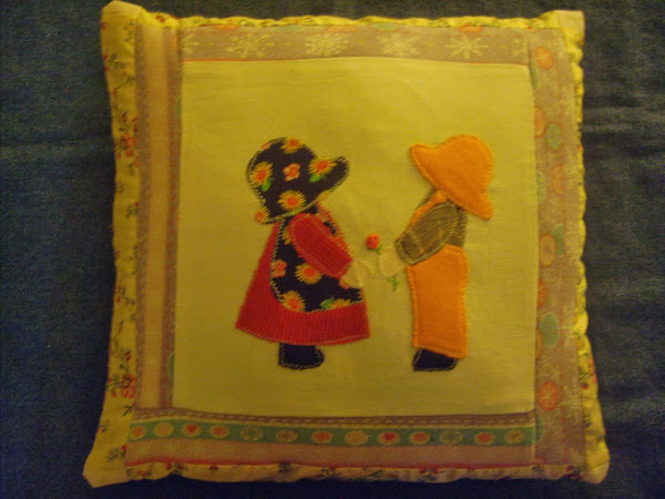 Como me gusta la técnica de patchwork y los apliques, y yo le estoy realizando a mis hijas unos acolchados , que ya los puse el paso a paso hace un tiempo atrás, se me ocurrió realizar el almohadón para que pueda combinar con el acolchado. En el acolchado el nene tiene la flor en la espalda para darle a la nena, pero ahora le hice la flor ya en el frente cuando se la entrega a la nena.