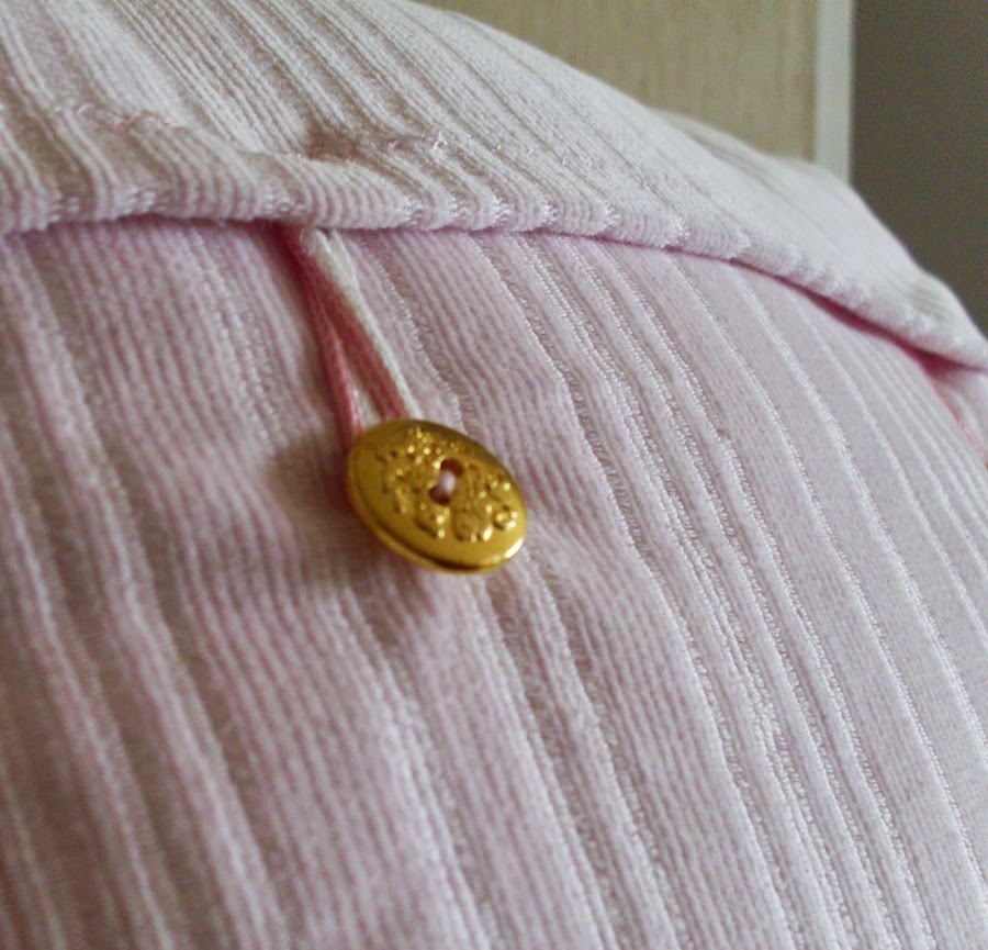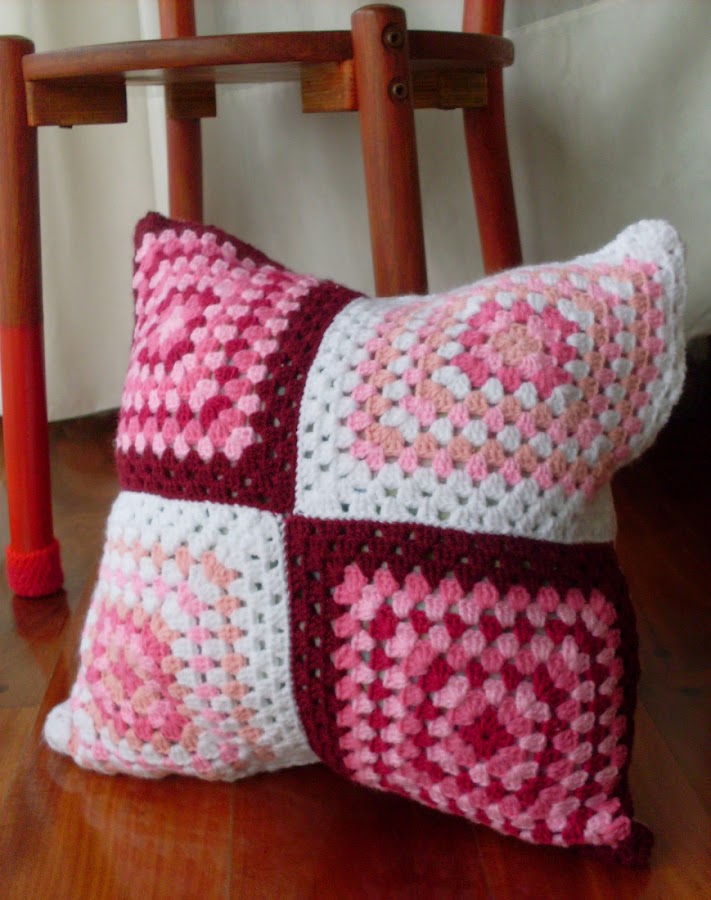 De un lado crochet, del otro tela de corderoy con 2 botoncitos dorados...