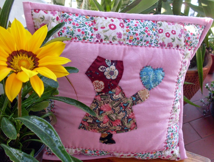Cosió este almohadón en tonos rosa con la figura de una muñeca Sarah Kay.