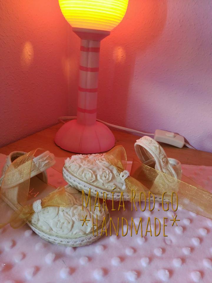 Alrededor de toda la suela le pegué con pegamento especial, una tira de encajes en los mismos tonos, y lleva un lazo de organza en color dorado a los lados de las alpargatas.