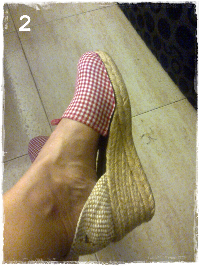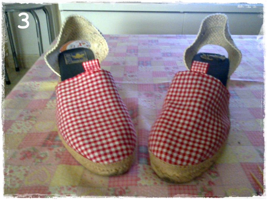 En un papel saqué una plantilla, dibujando la suela y dándole anchura un poco a ojo de cubero, probando sobre la tela vieja, algo parecido a una semicircunferencia pero con la forma de la punta.Una vez pasada a la tela de vichy, la fui adaptando a la zapatilla, empezando por el centro de la punta y cogiendo con alfileres hacia los lados, de este paso no hice foto (no tenía muy claro que me fueran a quedar bien y no me tomé demasiadas molestias). Una vez todo cogido con los alfileres, empecé a coser con hilo fuerte encima de la tela anterior, pero al llegar a la zona de la punta, la aguja no me daba ya de sí, ni mi mano llegaba al fondo, así que, opté, por pegar esa zona con pegamento textil, y dejé secar bien.