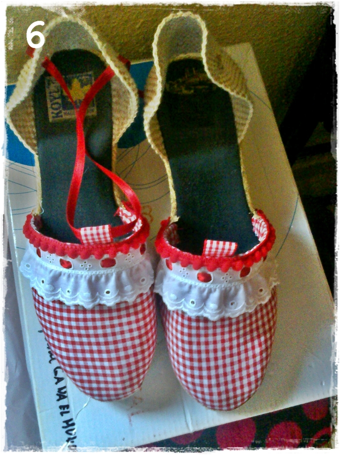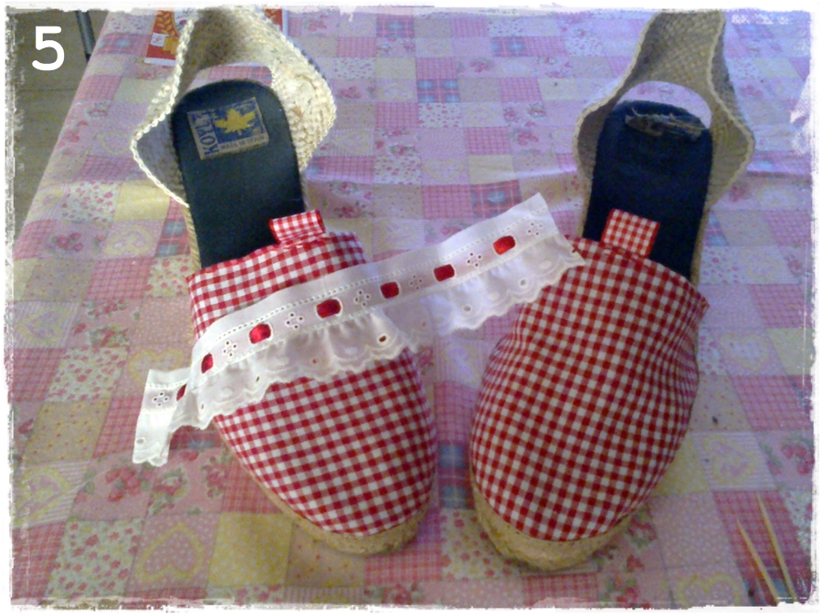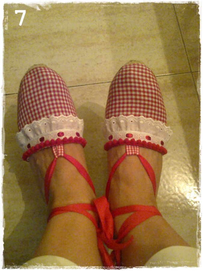 Yo, hace unos días, en mi ajuar zapatero, descubrí unas alpargatas de cáñamo con cuña, que tengo hace años, y que no me ponía, pues al ser negras, me resultaban un poco "sosas". Me disponía a tirarlas, pero mi alma diogenera me decía que ¡nooo!. Casualidades de la vida, en un grupo costuril de facebook en el que estoy metida, alguien subió foto de sus zapatillas tuneadas, y entonces ¡se me encendió la bombilla!.