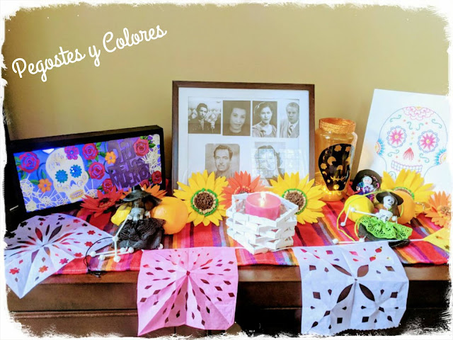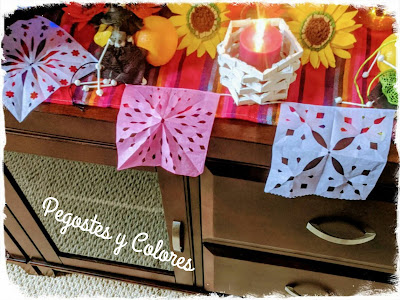 En México, el día 2 de Noviembre se celebra el Día de los Muertos, día en que recordamos y honramos la memoria de nuestros seres queridos.En esta ocasión he querido mostrarles el altar de muertos y papel picado que hemos puesto en la casa. No tiene todos los elementos exactos como se hace en México, use lo que tenia en casa tratando de que estuviera lo principal. Por ejemplo aquí no consigo flores de cempasuchil y los colores del papel picado no son exactamente los clásicos, pero hemos adaptado a lo que había en casa. El pan de muertos, lamento decirlo, se termino antes, pero tampoco me animo a ponerlo ahí por mi perrita. Igual la guirnalda de papel picado debería estar colgando mas, cosa que temo hacer por mi Daffy que es capaz de llegar y jalar todo.