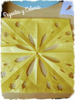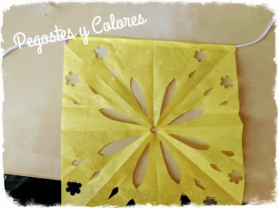 9.- Ya nada mas con un poco de pegamento ponemos el cordel en la orilla del cm extra en la parte superior, doblamos y dejamos secar. Repetimos con el resto de los papeles picados para hacer una guirnalda.