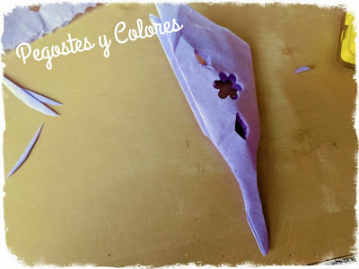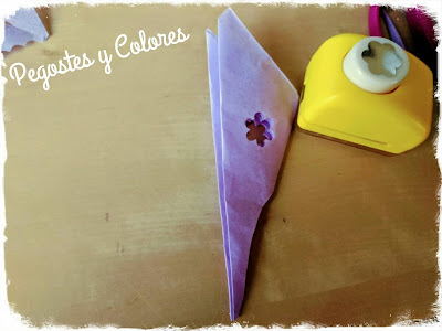 7.- Con una troqueladora de flor, hice una perforación como la que ven y con las tijeras corte apenas una punta de la esquina central. Luego corte una curva dejando una distancia con el corte central hacia arriba para hacer la mitad de un pétalo.