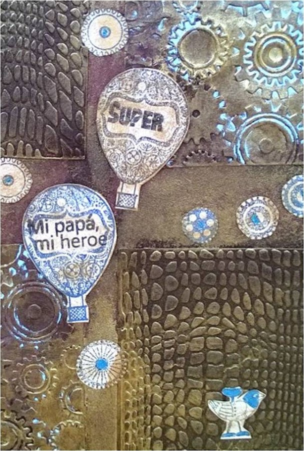 Aqui un acercamiento a los detalles con los sellitos Prima Marketing combinados con unos de sentimientos de Latina Crafter: "Súper Papá" sobre unas lindas texturas que se adaptan perfectamente al tema: