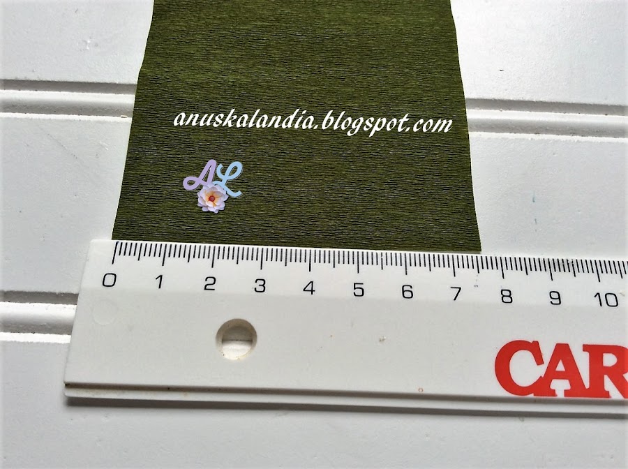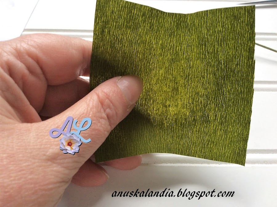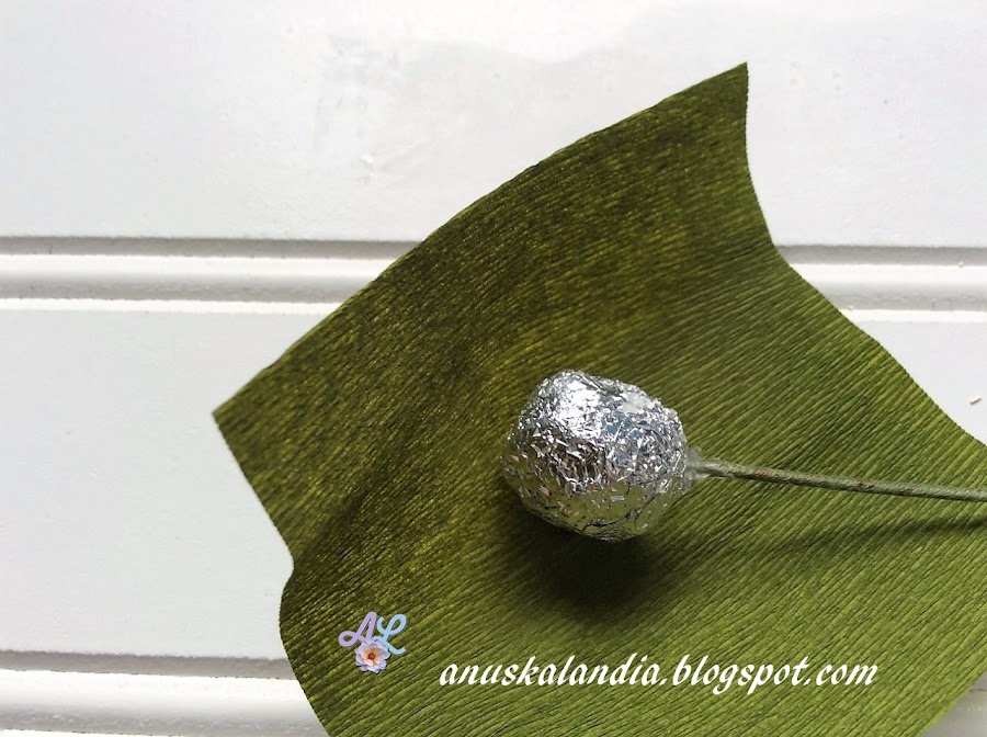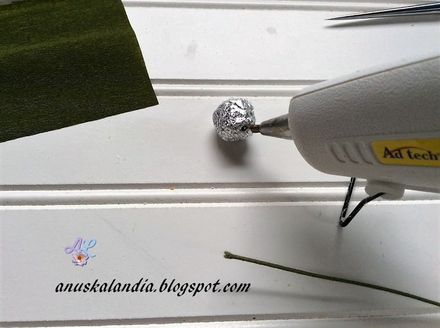Cortamos un trozo de papel crepé verde, cuadrado, de unos 7 cm. aproximadamente (para forrar la bola de papel aluminio). Antes de hacerlo, clavamos una herramienta punzante en dicha bola. Este es el momento de pegar el tallo. Colocamos pizca de silicona, en uno de los extremos del alambre floral. Introducimos en la bola. Esperamos que seque.