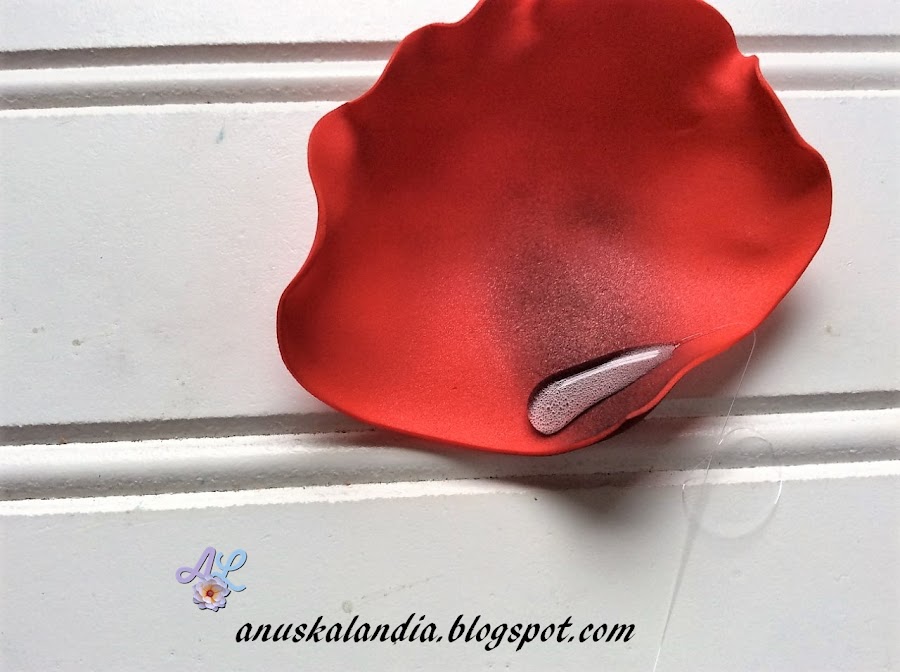 9.- Una amapola, consta solo de 4 pétalos, así que ponemos silicona en el primer pétalo, en la parte inferior y pegamos al pistilo desde su base. Antes de pegar los 3 pétalos restantes de igual forma, superponerlos sin pegar, para saber donde queráis que vaya cada uno.