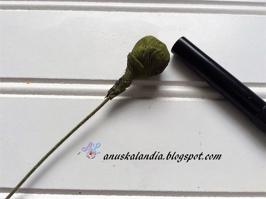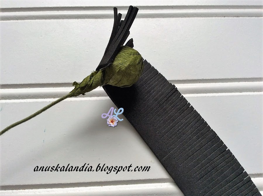 8.- Ponemos silicona, en una esquina de la tira de goma eva negra (que serían los estambres) y la pegamos por la base a la bola forrada de papel crepé (que sería el pistilo). Seguimos poniendo silicona a lo largo, enrollamos y pegamos. Acercamos a la plancha por la parte de los estambres, para dar un poco de forma y que parezcan más naturales.