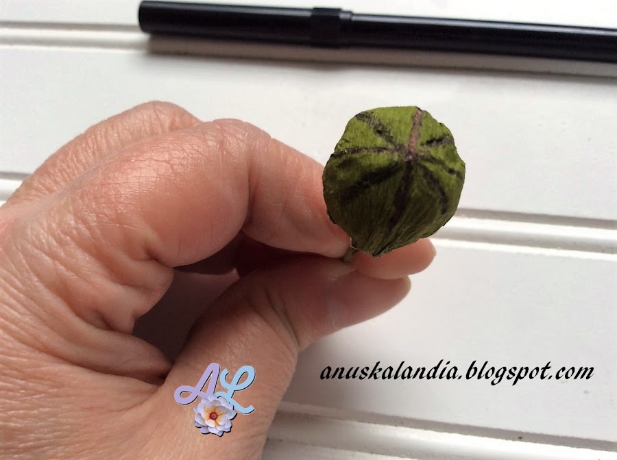 Con pintura cera pastel negra, pasamos por la esponja y esta por los pétalos, en la parte inferior y por ambos lados.
