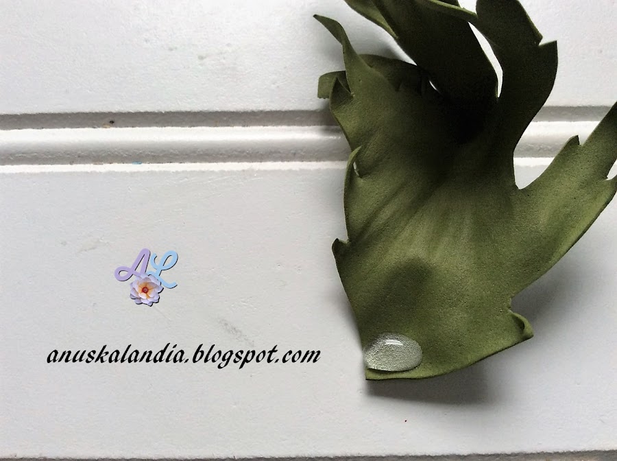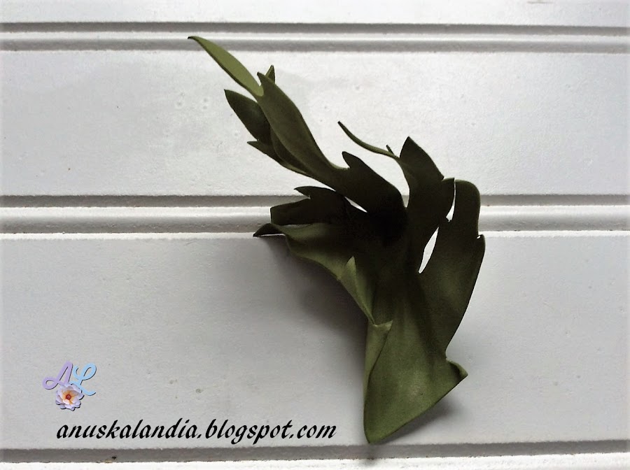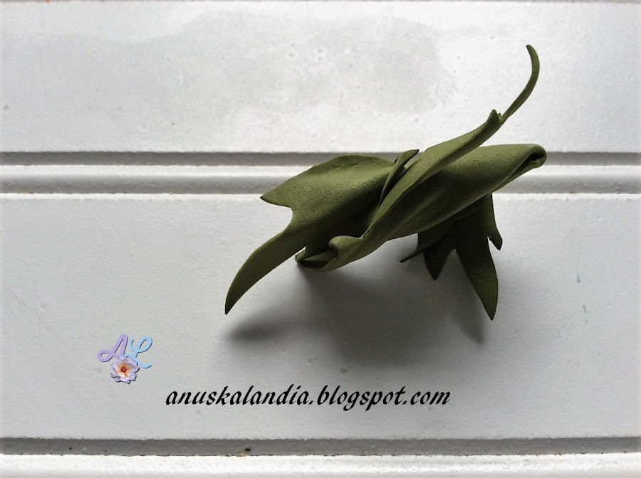 10.- Tomamos el molde de la hoja. Calentamos con la plancha. Doblamos y retorcemos. Mantenemos unos instantes. Desdoblamos. Ponemos silicona en la parte inferior y pegamos al alambre floral que es nuestro tallo.